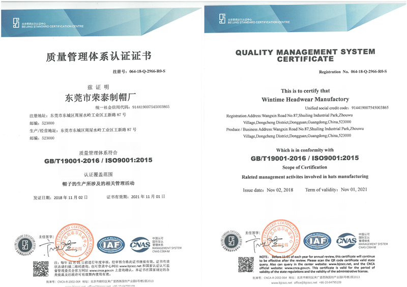 東莞帽子廠家的升華質(zhì)變,熱烈祝賀榮泰制帽廠通過ISO9001:2015質(zhì)量管理體系評審并獲得證書